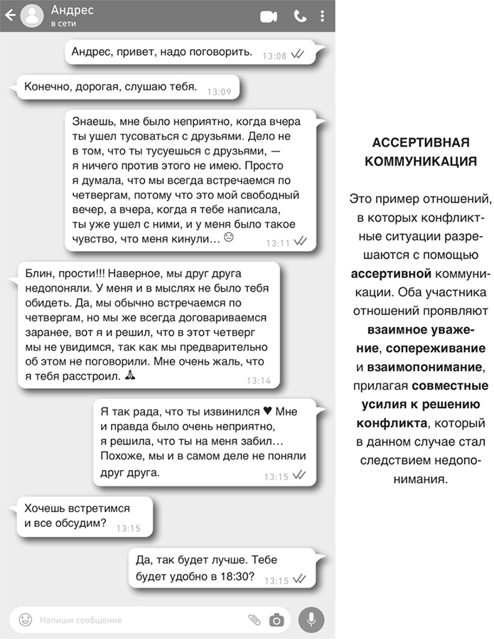 Эти переписки из WhatsApp говорят сами за себя. Думаю, ты согласишься со мной, что ассертивной коммуникации свойственен более приятный и примирительный тон.