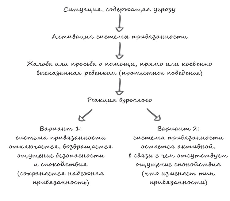 Как я уже рассказывала в книге «Полюбить себя, чтобы любить других», система привязанности активируется в ситуациях, подразумевающих для ребенка угрозу (т.е. неизвестных ему), и отвечает за то, чтобы обеспечить ему чувство безопасности. При активации системы привязанности ребенок ищет помощи у взрослого и, в зависимости от полученного ответа, либо у него развивается надежный паттерн привязанности, либо же у него формируется привязанность другого типа: избегающая, тревожная или дезорганизующая/дезориентированная.