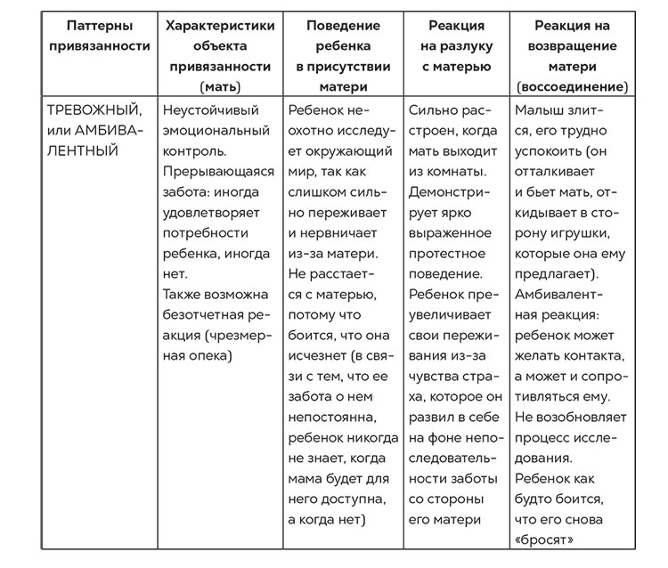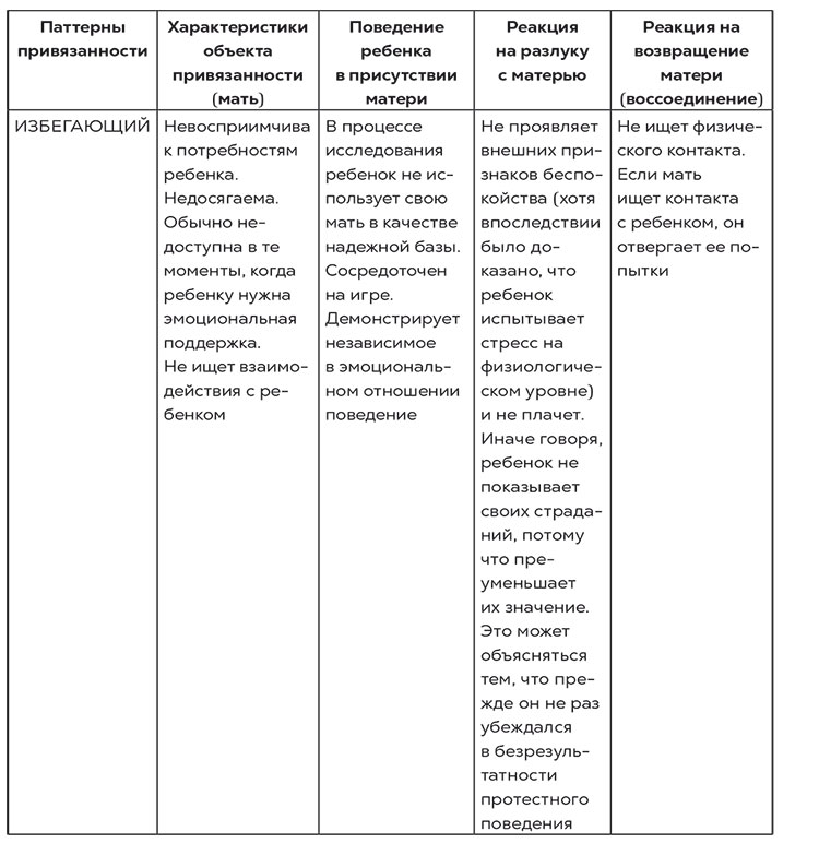 Рассмотрим признаки, характерные для каждого типа привязанности, в зависимости от того, как складываются у ребенка отношения с родителями. Для этого я приведу здесь фрагмент из книги «Полюбить себя, чтобы любить других», потому что, на мой взгляд, это достаточно подробное описание, которое может послужить основой для дальнейшего углубления в теорию.