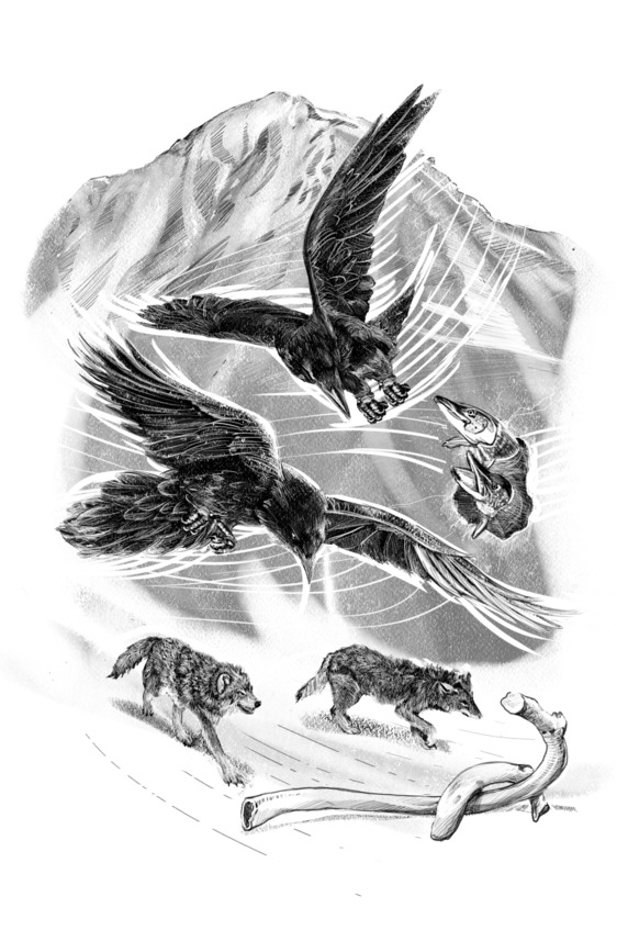 Прилетели два ворона, забрали ребра. Прошло еще семь дней, глядит охотник: видать под кожей еще пару ребер. Пришел он к озеру и крикнул:
