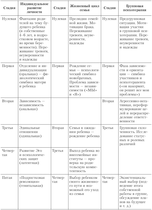 Таблица 1Сравнительный анализ стадий индивидуального развития личности, групповой психотерапии и жизненного цикла семьи