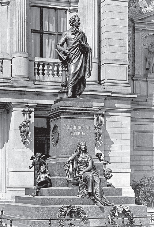 Тем временем, желая почтить память Мендельсона, столько сделавшего для местного оркестра и для немецкой музыки вообще, городские власти Лейпцига поставили перед зданием нового концертного зала огромный монумент композитору работы Вернера Штайна. В 1892 году, когда этот памятник торжественно открывали, публика увидела бронзовое изваяние Мендельсона, возвышавшееся над уровнем земли почти на шесть метров. Как выразился один член городского совета, памятник был зримым “выражением благодарности, которую испытывает наш город к человеку, чье имя мы произносим с любовью и почтением”[71].