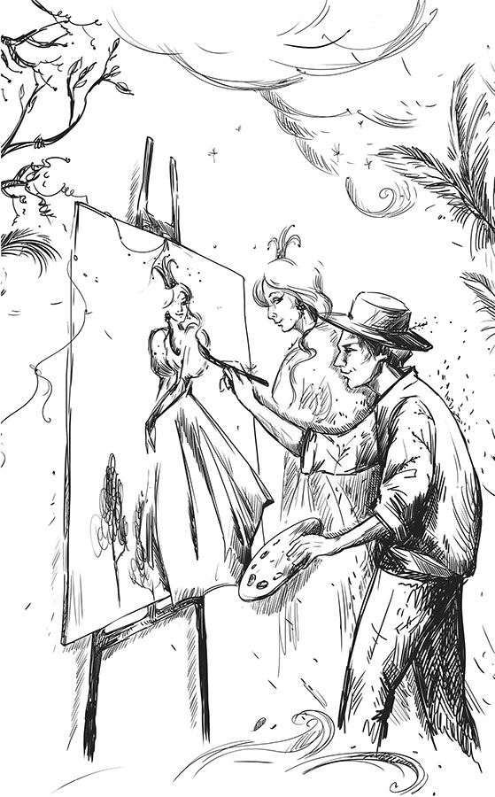 – Думаю, нам пора начать рисовать, – добавил художник и бодро зашагал по направлению к замку. Там он достал краски и поставил холст на мольберт.