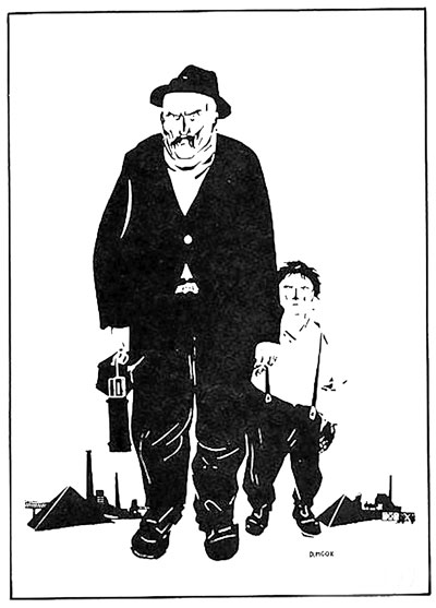 Лозунги и призывы становятся нормой мифологизации общественного мнения, проходящей красной линией через время до и после войны. Один из крупнейших художников Советского Союза Д. Моор в своей монографии, изданной в 1937 г., помещает рисунок, изображающий убогого шахтера с унылым подростком, выглядывающим из-за спины. Подпись под рисунком весьма характерна для того времени: «Всякий, кто теперь саботировал бы, кто не поддерживал целиком борьбу английских горняков, не заслуживал бы ни капли доверия рабочего класса».