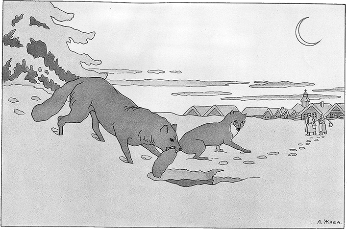 Лисица взлезть На виноград хотела,Хотелось ягод ей поесть; Полезла, попотела. Хоть люб кусок, Да виноград высок,И не к ее на нем плоды созрели доле,Пришло оставить ей закуски поневоле. Как до́бычи Лисица не нашла, Пошла, Яряся злобно,Что ягод было ей покушать неудобно.«Какой, – ворчала, – то невкусный виноград,До самых не созрел таких он поздних чисел; Хорош на взгляд, Да кисел». Довольно таковых Лисиц на свете, И гордости у них Такой в ответе.Лягушки, просящие царя