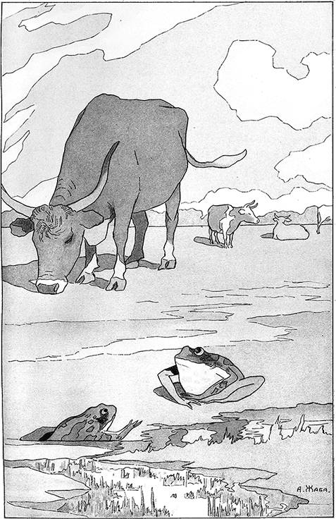 Лягушка, на лугу увидевши Вола, Затеяла сама в дородстве с ним сравняться – Она завистлива была –И ну топорщиться, пыхтеть и надуваться.«Смотри-ка, квакушка, что, буду ль я с него?» –Подруге говорит. «Нет, кумушка, далёко!» –«Гляди же, как теперь раздуюсь я широко. Ну, каково?Пополнилась ли я?» – «Почти что ничего». –«Ну, как теперь?» – «Все то ж. Пыхтела да пыхтелаИ кончила моя затейница на том, Что, не сравнявшися с Волом, С натуги лопнула и – околела. Пример такой на свете не один:И диво ли, когда жить хочет мещанин, Как именитый гражданин,А сошка мелкая, как знатный дворянин.