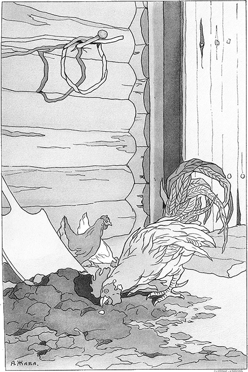 Лиса, скупая от природы, Вдруг хлебосолкою затеяла прослыть. Да только как тут быть,Чтоб не вовлечь себя в излишние расходы? Вопрос мудрен – решит его не всяк, Но для Лисы такой вопрос пустяк: Плутовка каши жидкой наварила, Ее на блюдо тонко наложила, И Аиста зовет преважно на обед. На зов является сосед,И оба принялись за поданное блюдо. Ну, кашка, хоть куда! Одно лишь худо, Что Аист есть так не привык: Он в блюдо носом тык да тык,Но в клюв ему ни крошки не попало; А Лисанька меж тем в единый миг Всю кашу языком слизала. Вот Аист в свой черед,Чтоб наказать Лису, а частью для забавы, Ее на завтра ужинать зовет.Нажарил мяса он, сварил к нему приправы, На мелкие кусочки накрошил И в узенький кувшин сложил. Меж тем Лиса, почуяв запах мяса,Пришла голодная, едва дождавшись часа, И ну, что было сил, Давай вокруг стола юлить и увиваться И щедрости соседа удивляться, Но лесть ей тут не помогла:По клюву Аисту кувшин пришелся впору,У гостьи ж мордочка чресчур была кругла…И жадная Кума ни с чем, как и пришла,Поджавши хвост, к себе убралась в нору.Петух и жемчужное зерно