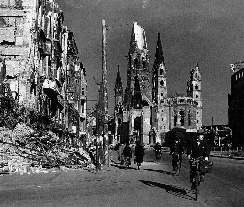 Берлин, 1945 год. Вид на разрушенную мемориальную церковь кайзера Вильгельма