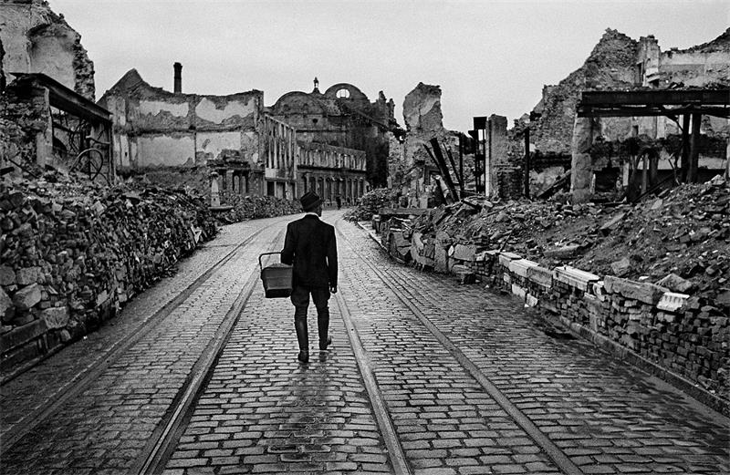 На одном фотоснимке 1945 года, сделанном Вернером Бишофом, какой-то по-воскресному одетый мужчина идет по этой чисто выметенной преисподней. Он снят со спины. Черная шляпа сдвинута на затылок, заправленные в высокие сапоги рейтузы в сочетании с элегантным пиджаком придают ему сходство с ротмистром. В руке у него плетеная корзинка, словно он идет за покупками, из-за чего фотография получила название «Мужчина в поисках пищи». Его бодрая походка и осанка выражают оптимизм и решимость; внимательный и любопытный взгляд устремлен вверх, и все это производит трогательное впечатление – мы словно видим кадр из какого-то совершенно другого фильма.