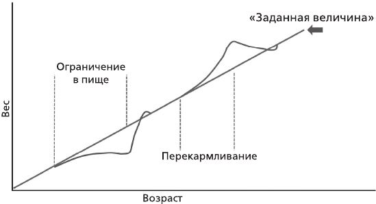 ЗАДАННАЯ ВЕЛИЧИНАМы исследовали этот вопрос десятилетиями и теперь точно знаем: тело у млекопитающих всеми силами защищает свой вес. Первые данные, подтверждающие это, были получены в результате работы с лабораторными крысами. Опыты, которые проводились в 1940-х годах, подтвердили: крыса, если ее посадить в клетку с достаточным количеством еды и развлечений, будет расти с определенной скоростью (грызуны, кстати говоря, растут всю свою жизнь, пока не умрут). Если количество еды, которую давали крысе, уменьшалось (крысу «сажали на диету»), то она теряла вес – что неудивительно. Как только количество еды становилось прежним, крыса быстро набирала вес. Любопытно, что скорость замедлялась, как только крыса восстанавливала вес, который у нее был до «диеты», – и потом продолжала расти с обычной скоростью. Когда крысам начинали давать аппетитные лакомства с большим содержанием сахара и жира, они тоже быстро набирали вес. Потом им снова давали нормальную еду – и крысы сбрасывали вес и опять возвращались к своему нормальному темпу роста. Эти эксперименты привели к так называемой гипотезе заданной величины, суть которой в следующем: траектория роста всех млекопитающих при стабильных условиях жизни генетически обусловлена. И любое отклонение от этой траектории, как показывает история с нашими крысами, будет исправлено.