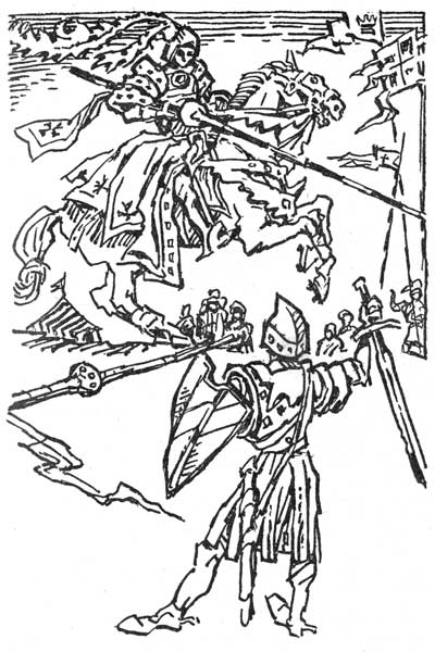 Потом начался турнир. На арену вышли два помощника герольдов и объявили имена первых соперников, каждый из них прославлял до небес храбрость своего господина и его родословную, тут же переходя на оскорбления в адрес его противника. Потом эти низкорожденные ушли, и оруженосцы развели своих сидевших верхом хозяев на противоположные концы арены.