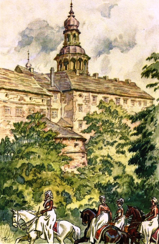 Умолкнув, наблюдали он за герцогиней с двумя дочерьми в сопровождении двух слуг, уносящимися вдаль к другому подворью. Когда и его миновали, подъехали к замку, быстро свернули на дорогу, с которой слышалось по-чешски: «Ваша милость!» Дамы заметили плохо одетого человека, и ещё одного крестьянина, волочившегося за панским холопом. Холоп покорно приветствовал, крестьянин поплёлся дальше, но от взглядов высшего общества не скрылся и криком своим их не обеспокоил.