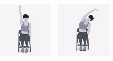 Итак: точно также, как и предыдущее упражнение, оно выполняется сидя на стуле (табурете). Одновременно с выдохом наклоняемся сначала в одну сторону, помогая себе одной рукой (тянемся по диагонали в сторону). При этом другой рукой можно придерживаться за рай стула/табурета. Со вдохом – возвращаемся в исходное положение. Со следующим выдохом – повторяем на другую сторону. И так 12-20 раз всего (по 6-10 на каждую сторону).