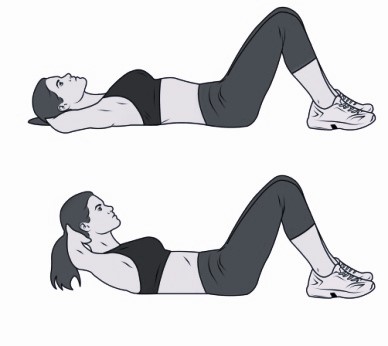 4. Неполные скручивания. Исх. положение: лежа на спине, ноги согнуты в коленях, стопы стоят на полу, ладони на затылке. Техника выполнения упражнения: одновременно с выдохом плавно приподнимаем голову, шею и плечи от пола, не отрывая поясницу. При этом локти разведены строго в стороны, взгляд направлен вверх. Далее, вдыхая, опускаемся вниз. И так раз 6-12. Если не получается поднять свое тело из положения “лежа на спине”, можно попробовать разместить валик под поясницей. Это облегчит задачу.
