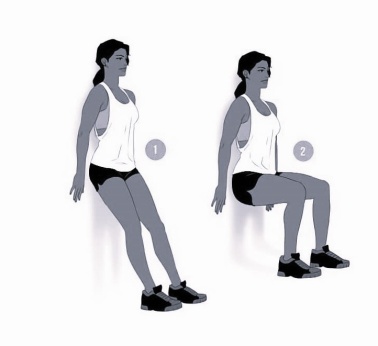 Исходное положение: стопы чуть шире, чем ширина бедер, носки немного врозь, спина прижата к стене и прямая. Особенно важно плотно прижать поясницу к стене. Плавно “сползаем” по стене вниз до прямого угла между голенью и бедром, и “сидим”. Бедра параллельны полу, дыхание ровное. Держать такое положение нужно от 20 секунд. Маленьким и слабеньким и эти секунды покажутся вечностью, но всё же будем стараться. Выполняем упражнение подходами, то есть 2-3 раза по 20-60 секунд. Если возможно дольше – отлично, “сидим” дольше. Это упражнение ненавидят все: от мала до велика, но оно того стоит. Если бы можно было сделать подборку из упражнений для “стройного тела за 5 минут в день”, то это упражнение – упражнение “стульчик”, однозначно входило бы в этот перечень.