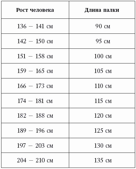В таблице, приведенной ниже, можно ознакомиться с правильной длиной палки для скандинавской ходьбы.