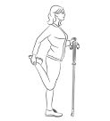 5. Растяжка передней поверхности бедра. Не знаю, насколько успешно ты сможешь выполнить такое упражнение (особенно, когда есть лишний вес), поэтому предложу несколько возможных вариантов выполнения упражнения. В оригинале: держимся рукой за палки для ходьбы, а другой рукой обхватываем лодыжку одной ноги и стараемся “притянуть” пятку к ягодице. Обрати внимание на положение бедер и коленей – они находятся на одном уровне. Задержись в таком положении на 40-60 секунд, затем поменяй стороны. Это же упражнение используй и для “заминки” ( растяжки после занятия). Поясницу постарайся не прогибать, спину держать прямо. Самое сложное для новичков это, как правило, просто-напросто устоять на месте. Поэтому держись за палку крепче.