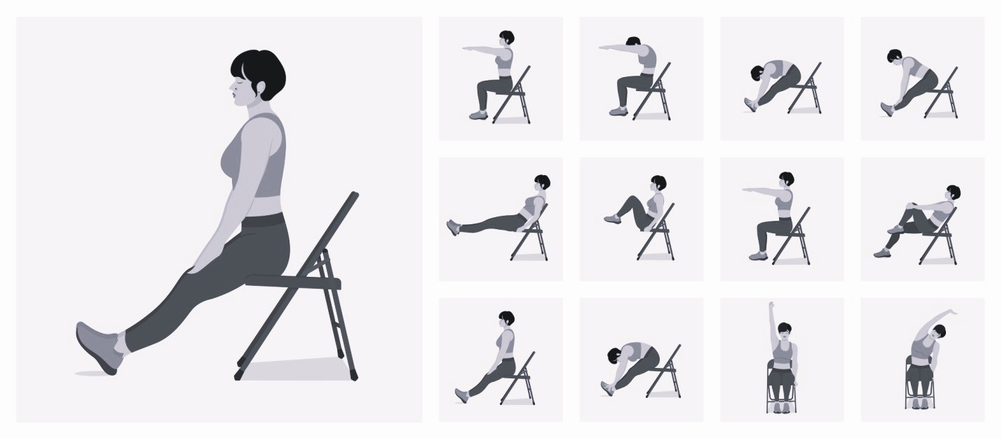 8) Приседания со стулом. Спина прямая, стопы на ширине таза. Руки можно вытянуть перед собой, а можно сложить удобно. С вдохом садимся, чуть касаясь стула. С выдохом – поднимаемся. 12-20 раз за 2-3 подхода.