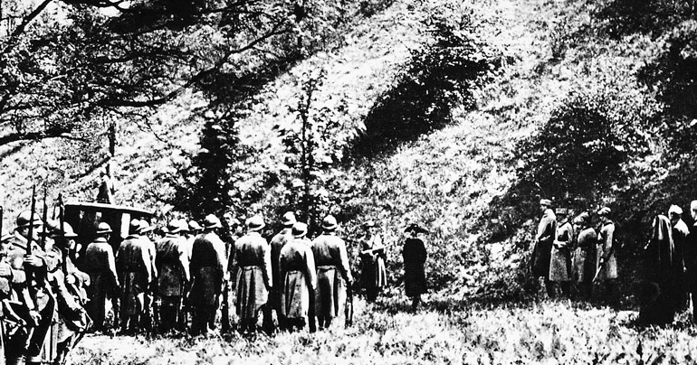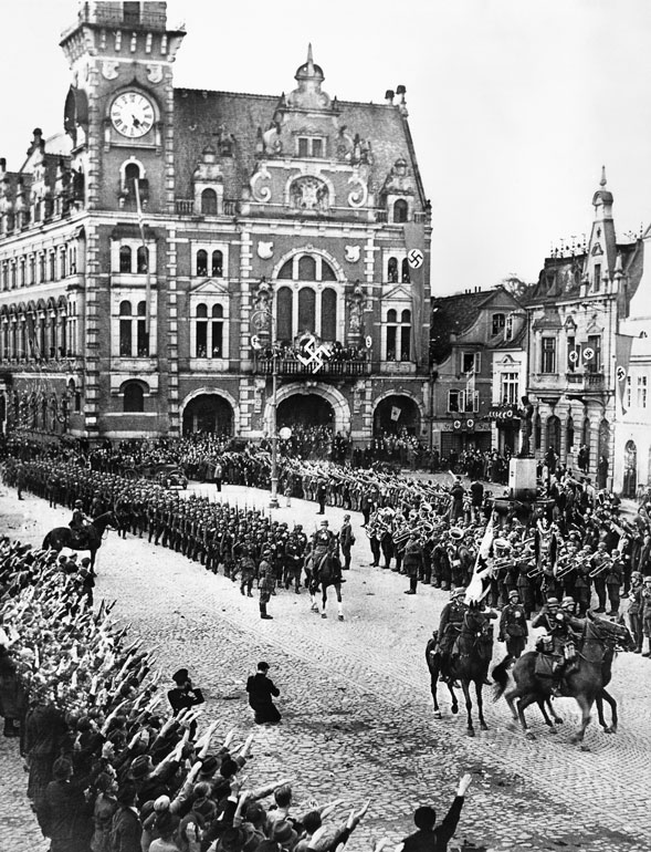 Германская военная колонна входит в один из городов в Судетской области в октябре 1938 г., встречая горячий прием со стороны местных жителей-немцев