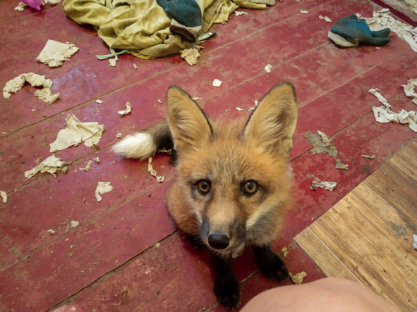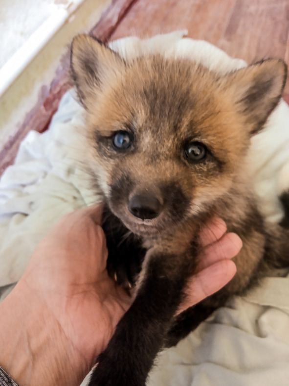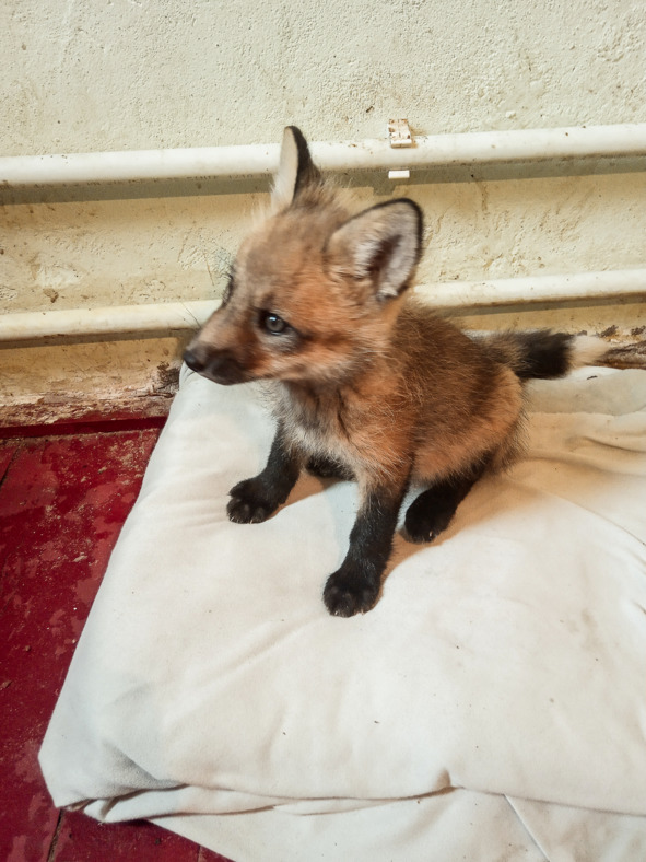 Лисичка оказалась маленькой дикаркой. Она не дается в руки, прячется между стеной и коробкой, фырчит на нас. Мы заранее приготовили бутылку с соской и козье молоко. Теперь осталось дело за малым – поймать малышку и накормить.