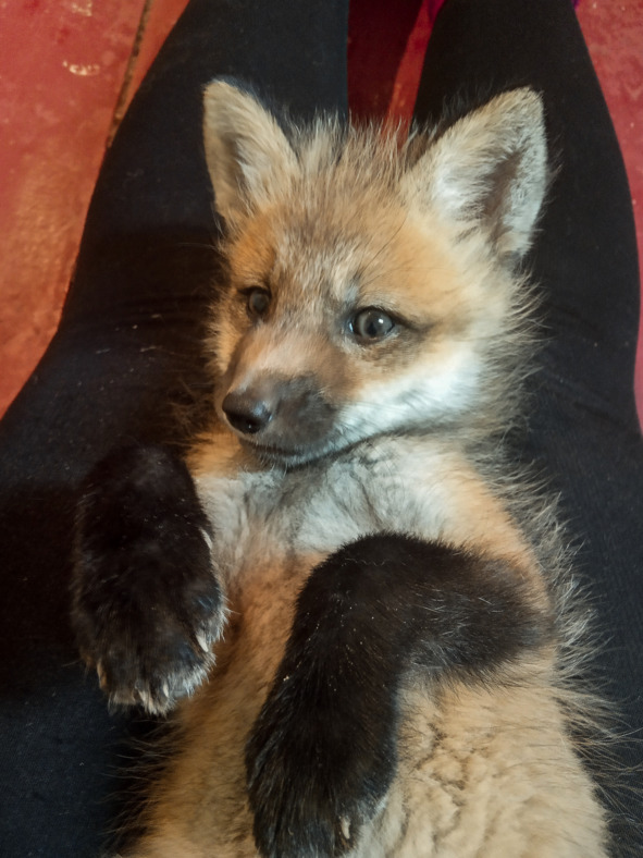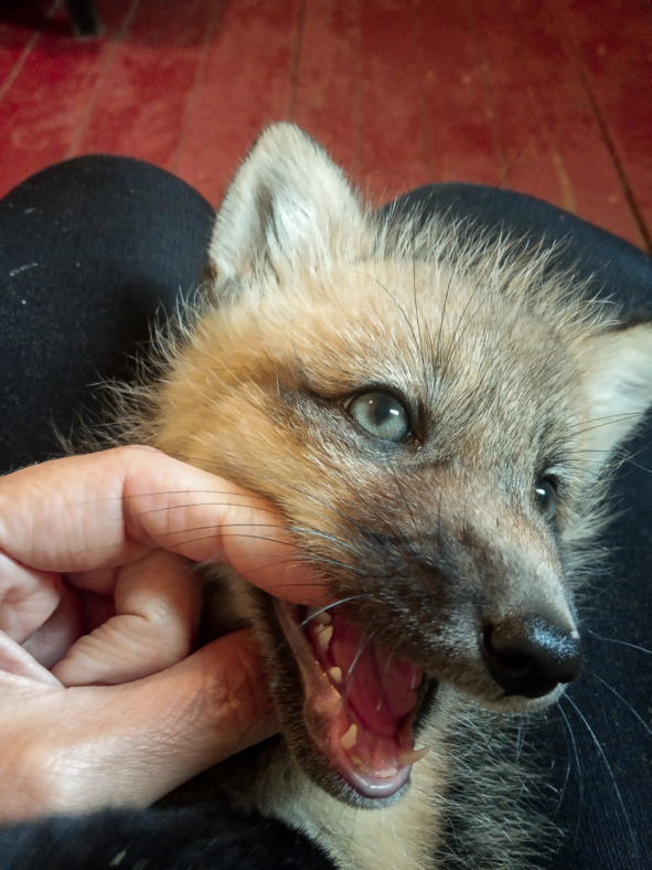 Даю лисичке на пальце небольшой кусочек паштета для щенков и чувствую ее острые зубки. Она с жадностью проглатывает предложенное и, ищет еще. Какое молоко? Ей нужно мясо. Настоящая маленькая хищница. Еще несколько кусочков паштета быстро исчезают в лисьей пасти. Ну, вот и порядок. Контакт установлен. Питомец накормлен. Всем спать.
