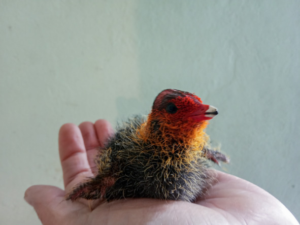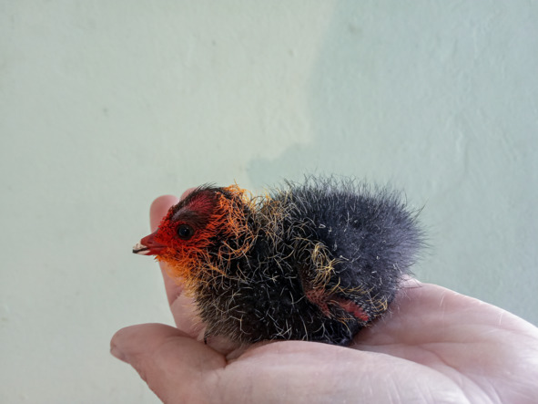 Птенец был мокрым и замерзшим. Он громко пищал. Люди нашли его в зарослях камыша. Вернее сказать, нашла птенца их собака. Скорее всего в камышах было гнездо, а собаки спугнули мамку и птенцов.