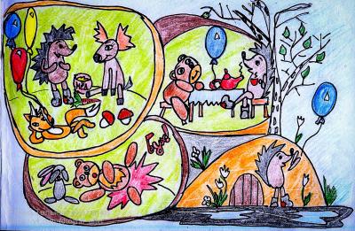 Заяц подарил Ёжику морковку. Медвежонок – мёд, Лосёнок – рябину, Белка – грибы. А Лисёнок подарил три воздушных шарика: самый лучший подарок: красный, синий, жёлтый. "Где ты взял такие замечательные шарики?" – спрашивали зверята. А Лисёнок и рассказал, что возвращаясь с рыбалки через дорогу, что от города людского идёт, спрятался в кустах, пока ехали с ярмарки на телега мужчина, да внучка, шарики же были привязаны за поручень. На повороте шарики зацепились за низкие ветви дерева веревочками и отвязались от телеги. Вот Лисёнок их там и подобрал.