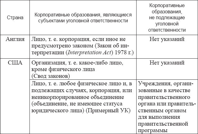 Виды корпоративных образований, подлежащих и не подлежащих уголовной ответственности по уголовному законодательству зарубежных стран