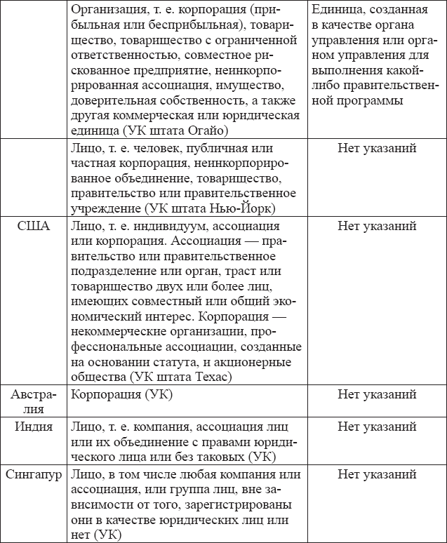 Из табл. 1 видно, что законодатели зарубежных стран именуют юридическое лицо по-разному (корпорация, компания, организация, объединение, предприятие, ассоциация, союз, товарищество, общество, учреждение). При этом все они сходятся во мнении о возможности применения уголовно-правовых санкций как к коммерческим, так и к некоммерческим юридическим лицам, а в некоторых странах (США, Голландия, Бельгия, Польша, Индия, Сингапур[43]) – и к организациям, не имеющим статуса юридических лиц.