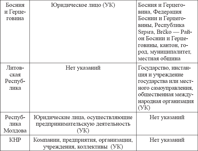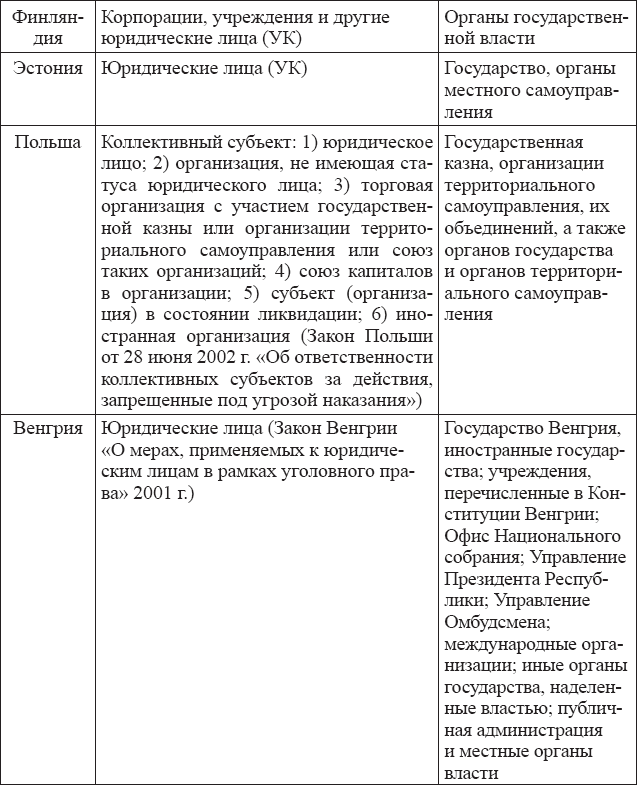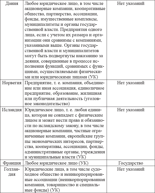 Вместе с тем если в одних странах в уголовном законодательстве нет никакой дополнительной информации относительно ограничения круга корпоративных образований, могущих нести уголовную ответственность и подвергаться иным мерам уголовно-правового характера (Англия, Индия, Австралия, Сингапур, Голландия, Норвегия, Исландия, Израиль, КНР[44]), то в других – законодатель дает перечень корпоративных образований, подлежащих и (или) не подлежащих уголовной ответственности (США, Франция, Бельгия, Дания, Финляндия, Польша, Венгрия, Босния и Герцеговина, Литва, Молдова, Эстония[45]).