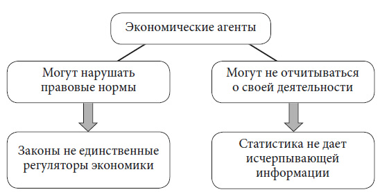 Заметим, это не значит, что неформальная деятельность никак не отражается в национальной статистике, например в ВВП страны. Мы говорим лишь о том, что сами участники неформальной экономики хранят молчание. Они избегают рассказов о себе. Это молчаливые участники национальной экономики. И только с помощью специальных, довольно изощренных методов, о которых мы поговорим отдельно, официальная статистика говорит нам о доли «ненаблюдаемой экономики» в ВВП страны.