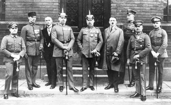 Вожди «Пивного путча» 1923 года. Слева на право: Гейнц Пернет, Фридрих Вебер, Вильгельм Фрик, Герман Крибель, Эрих фон Людендорф, Адольф Гитлер, Вильгельм Брюкнер, Эрнст Рем, Роберт Генрих Вагнер
