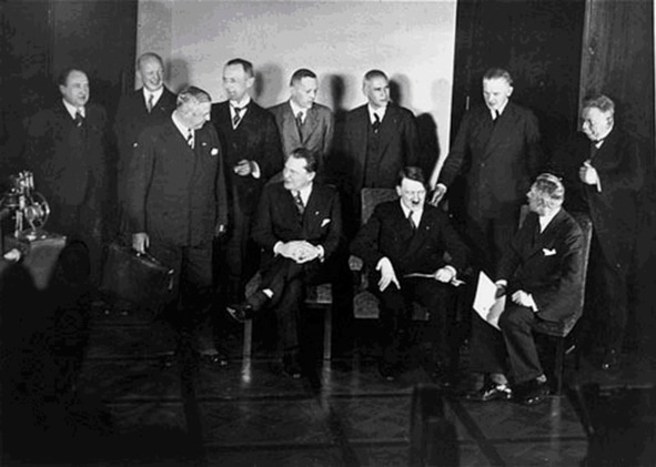 Первый Кабинет министров А. Гитлера 30.01.1933. Сидят: Герман Геринг, Адольф Гитлер, Франц фон Папен. Стоят (слева – направо): Вальтер Функ, Ганс Генрих Ламмерс, Франц Зельдте, Гюнтер Гереке, Лютц Шверин фон Крозигк, Вильгельм Фрик, Вернер фон Бломберг, Альфред Гугенберг