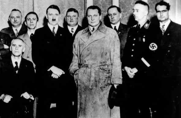 Высшее партийно-государственное руководство Германии после прихода нацистов к власти. Слева направо: Вильгельм Кубе, Ганс Керрль, Вильгельм Фрик (сидит), Йозеф Пауль Геббельс, Адольф Гитлер, Эрнст Рем, Герман Вильгельм Геринг, Рихард Вальтер Даррé, Генрих Гиммлер, Рудольф Гесс
