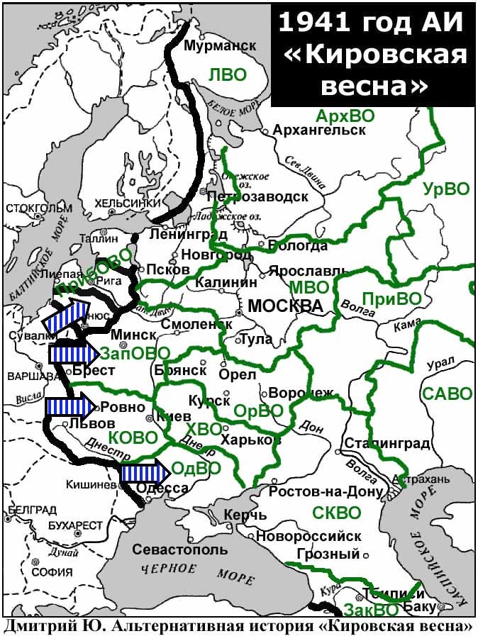 К осени 1940 года в альтернативной реальности «Кировская весна» на территории СССР и его союзников (Литвы, Латвии и Эстонии) действовало 17 военных округов: Ленинградский (ЛВО), Прибалтийский особый (ПрибОВО), Западный особый (ЗапОВО), Киевский особый (КОВО), Одесский (ОдВО), Архангельский (АрхВО), Московский (МВО), Орловский (ОрВО), Харьковский (ХВО), Приволжский (ПОВО), Северо-Кавказский (СКВО), Закавказский (ЗакВО), Среднеазиатский (САВО), Уральский (УрВО), Сибирский (СибВО), Забайкальский (ЗабВО) и Дальневосточный (ДВО).