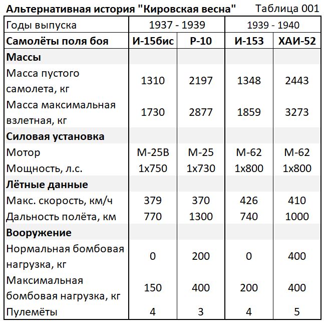 Сравнение тактико-технических характеристик конкурировавших между собой в недоброй памяти 1937 году самолетов И-15бис и Р-10 с мотором М-25, а также их модификаций 1940 года с более мощным мотором М-62 (И-153 и ХАИ-52), приводится в таблице 1.
