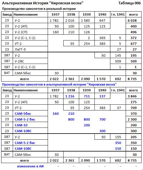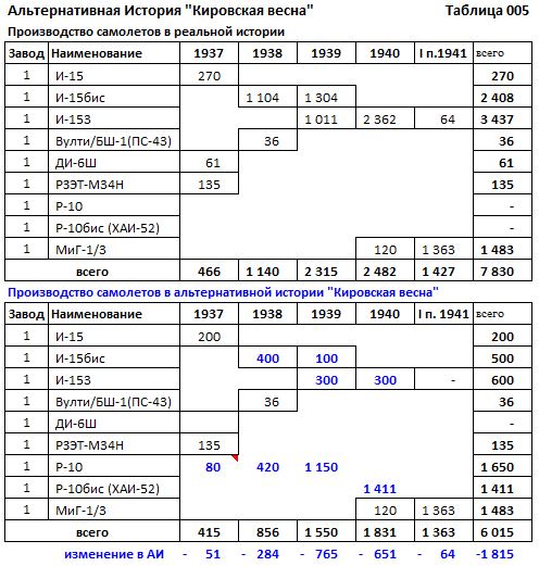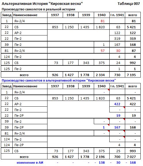 В итоге вышеуказанных изменений производственных программ авиазаводов, в альтернативной реальности «Кировская весна» общее число произведенных за период с 1935 года по первую половину 1941 года самолетов снизилось на 1896 единиц.