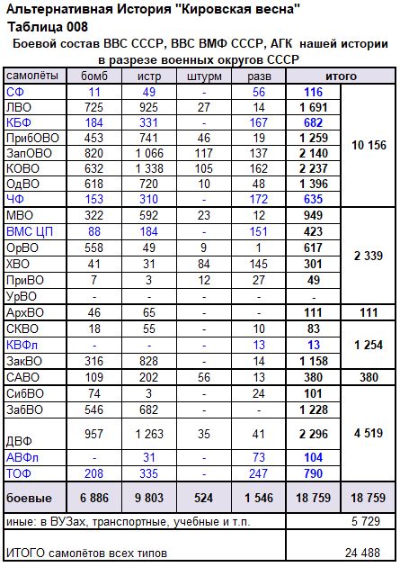 Таким образом, в альтернативной реальности «Кировская весна» 22 июня 1941 года советский самолетный парк включает в себя 16800 боевых самолетов (в том числе 6650 бомбардировщиков, 5650 истребителей, 1700 штурмовиков и 2800 разведчиков) и 5700 иных самолетов (боевых самолетов военных учебных заведений, а также учебных, учебно-тренировочных, самолетов связи, транспортных, пассажирских и т.п. самолетов ВВС РККА и ВМФ СССР) – всего 22500 самолетов.