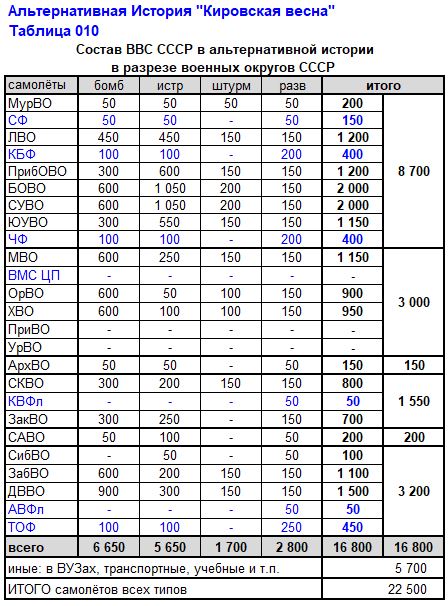 Распределение в альтернативной реальности «Кировская весна» авиации по типам самолетов по военным округам указано в таблице 10: