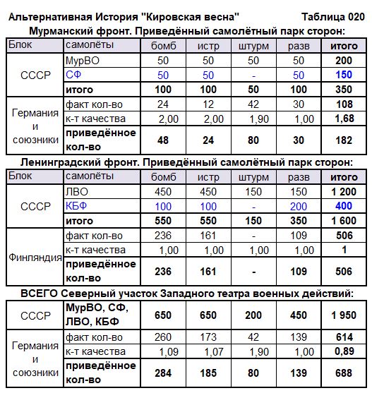 В альтернативной истории «Кировская весна» соотношение фактического и приведенного числа боевых самолетов в зонах ответственности Мурманского и Ленинградского военных округов с учетом сил Северного и Краснознаменного Балтийского флота указаны в таблице 20: