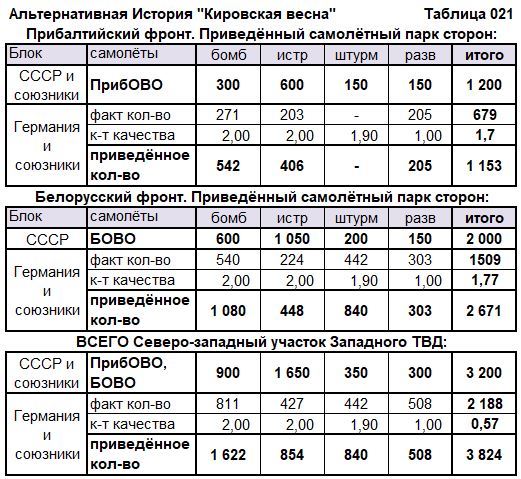 В альтернативной истории «Кировская весна» соотношение фактического и приведенного числа боевых самолетов в зонах ответственности Прибалтийского и Белорусского военных округов указаны в таблице 21: