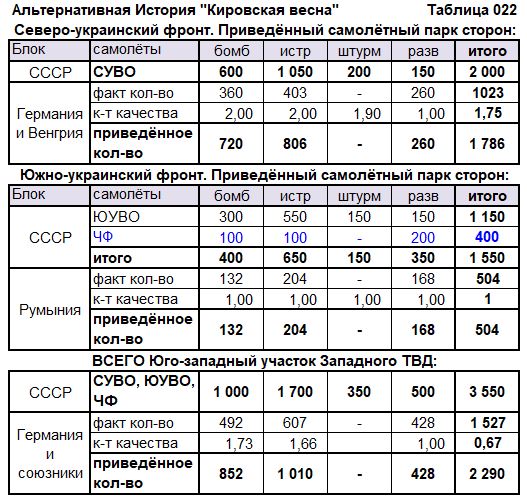 В альтернативной истории «Кировская весна» соотношение фактического и приведенного числа боевых самолетов в зонах ответственности Северо-Украинского и Южно-Украинского военных округов с учетом сил Черноморского флота указаны в таблице 22: