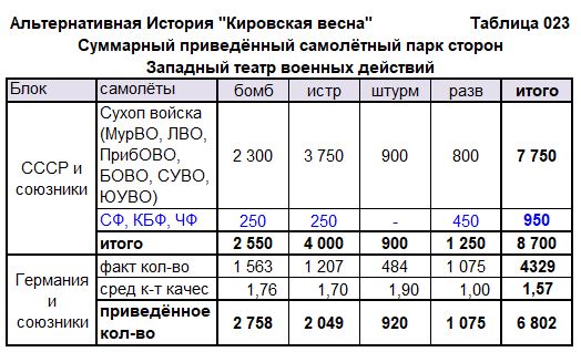 Соотношение фактического и приведенного числа боевых самолетов по типам на западном ТВД в целом на фронтах Альтернативной истории «Кировская весна»: Мурманский и Ленинградский военные округа плюс Северный и Краснознаменный Балтийский флот, Прибалтийский и Белорусский военные округа, Северо-Украинский и Южно-Украинский военные округа плюс Черноморский Флот указано в таблице 23.