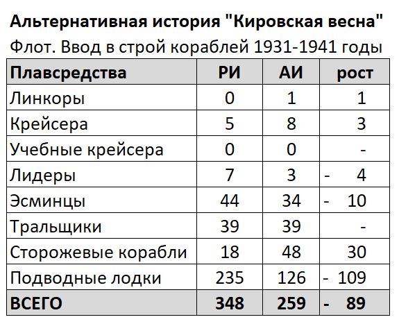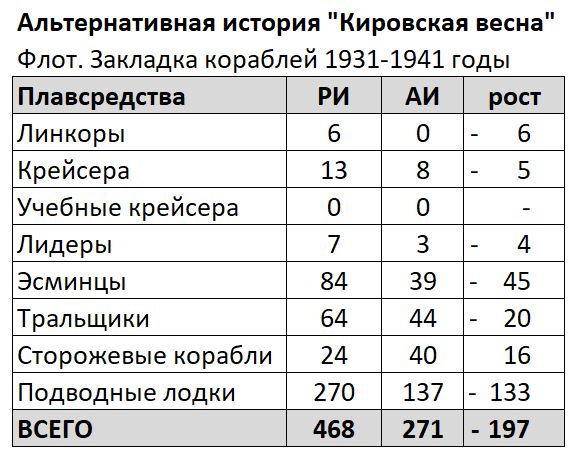 Оставив вне поля нашего внимания катера и речные мониторы, дадим далее несколько таблиц, показывающих отличие кораблестроительной программы в альтернативной истории «Кировская весна» от нашей реальности.