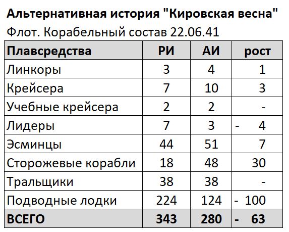 С учётом потерь, корабельный состав на 22.06.1941 года в реальной истории (РИ) и в альтернативной истории (АИ) описан в таблице: