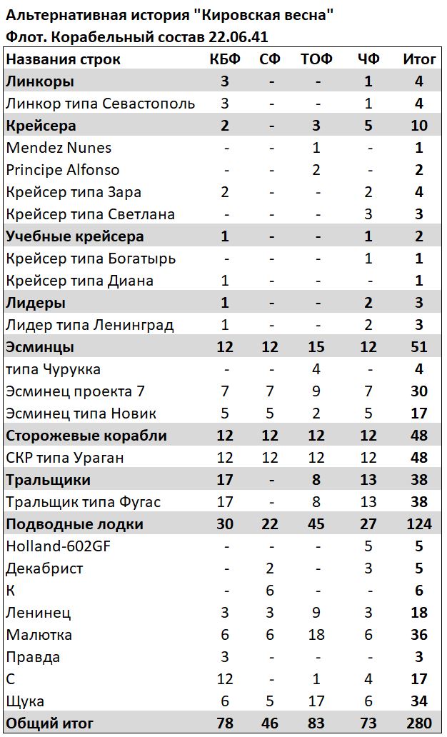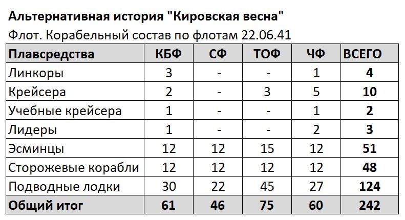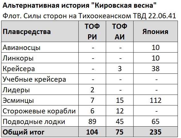Таким образом, корабельный состав Тихоокеанского флота в альтернативной реальности «Кировская весна» по основным типам боевых кораблей на 29 единиц меньше, чем в реальной истории. Однако, из анализа числа кораблей по отдельным боевым классам видно, что наличие 3 испанских крейсеров, 15 эсминцев и 12 сторожевых кораблей не только компенсируют снижение числа подводных лодок с 89 до 45, но и делают советский ТОФ заметно сильнее, чем он был в реальной истории.