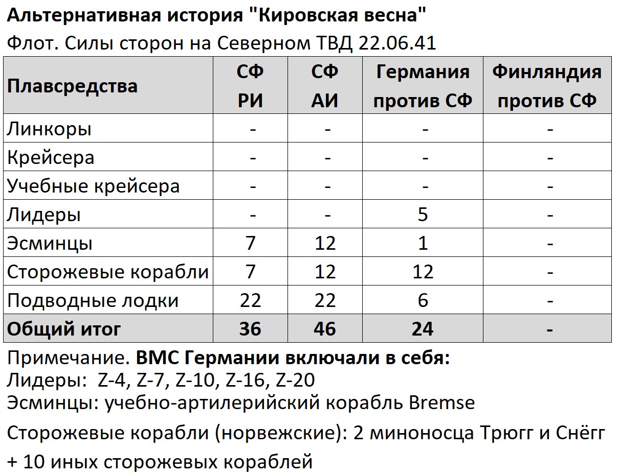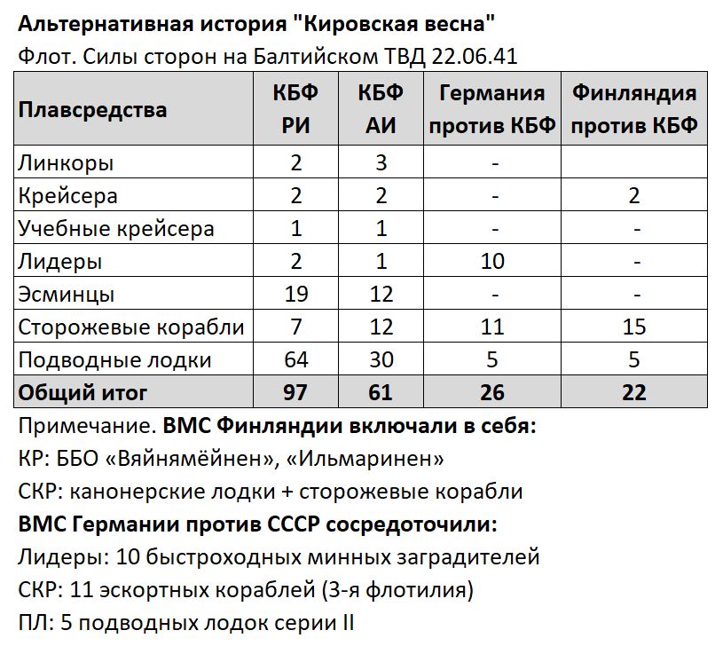Как видно из вышеуказанных таблиц, в реальной истории силы и средства ВМФ СССР по состоянию на 22.06.1941г. превосходили силы и средства флотов наших врагов на Балтийском, Черноморском и Северном театрах военных действий. Численное превосходство ВМС РККА сохраняется и в альтернативной реальности «Кировская весна», но реализуется несколько иначе.
