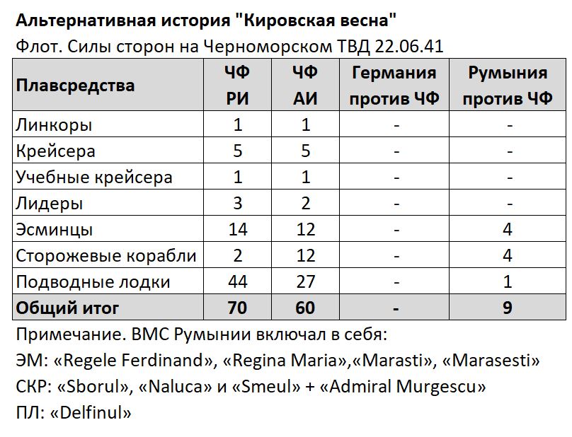 Таким образом, корабельный состав Черноморского флота в альтернативной реальности «Кировская весна» по основным типам боевых кораблей на 10 единиц меньше, чем в реальной истории.