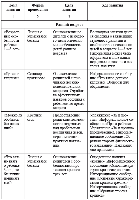 Малыш – не уменьшенная копия взрослого. Он живет по своим возрастным законам, знание которых помогает родителям лучше понимать и развивать своего ребенка. В первом, вводном, занятии даются сведения о важнейших ступенях в развитии и особенностях психологии детей в возрасте 1–3 лет. Занятие проходит в форме лекции с элементами беседы, носит рекомендательный характер. Информация может быть оформлена в виде папки-передвижки, заочного лектория, памятки. Опыт работы по данной теме представлен в приложении 1.