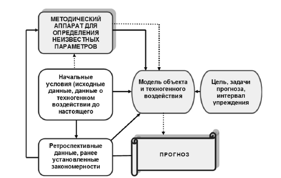 При создании модели процесса техногенного воздействия исходят из целей и задач прогнозирования и учитывают интервал упреждения (заданный отрезок времени с момента производства прогноза до момента в будущем, для которого этот прогноз делается).